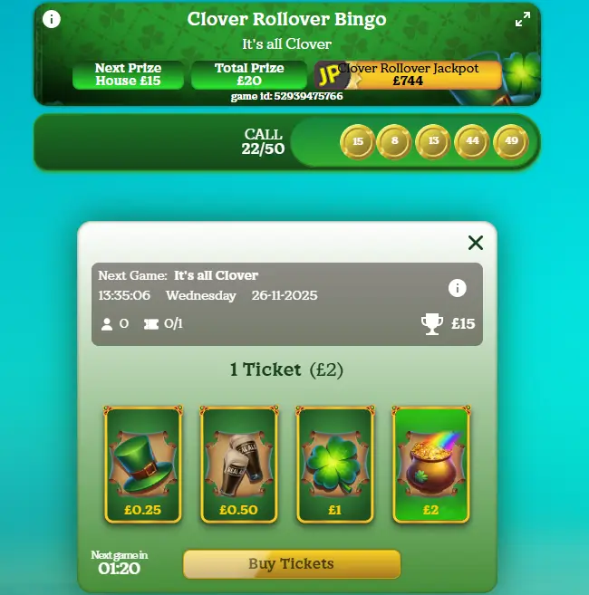 Each ticket bought nudges the pot higher. It’s shared across Clover Rollover Bingo rooms, so the jackpot keeps rolling until one lucky player scoops it.